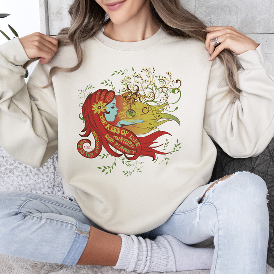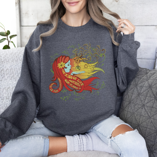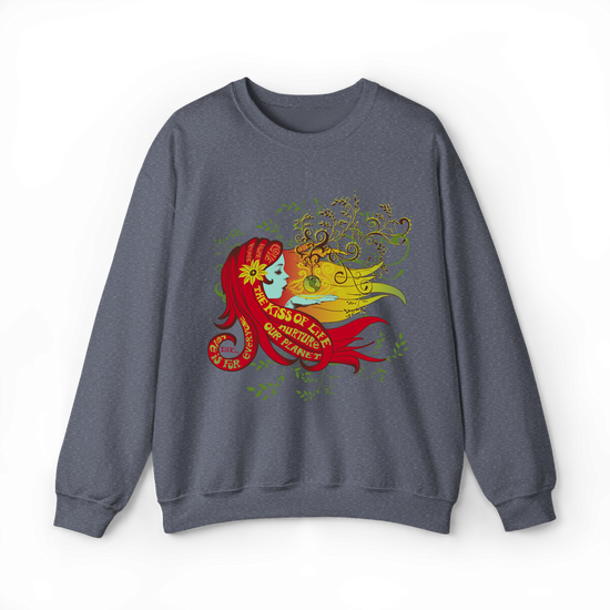 Stay warm in a true L.I.F.E. classic. Our 2008 Kiss of Life artwork makes its return on the cozy, durable Gildan 18000 fleece crewneck, available in Sand and Dark Grey Heather.