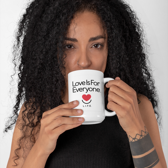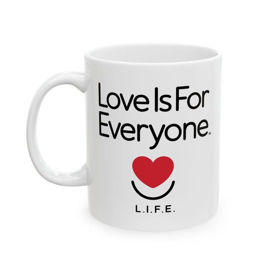 The L.I.F.E. "Love is for Everyone" 11oz Ceramic Mug adds a little joy to every pour. Printed with our smiling heart logo and bold message, this ceramic coffee mug is a daily reminder to share kindness at your desk, in your kitchen, or in your favorite reading nook. Glossy white, easy to hold, and sized just right for morning coffee, tea or cocoa.