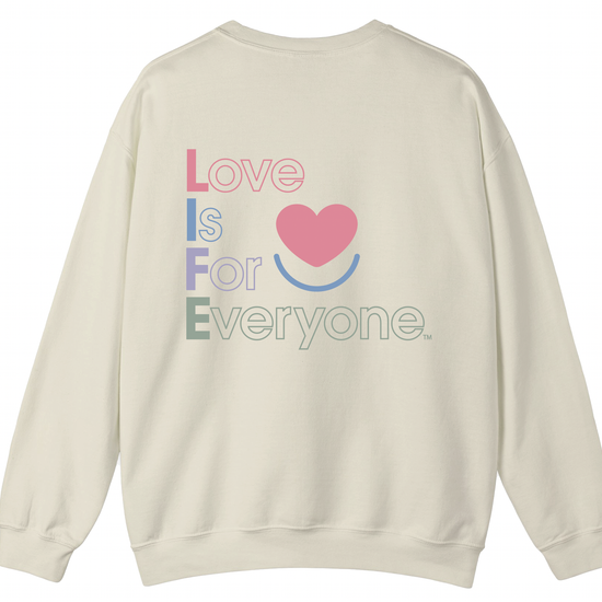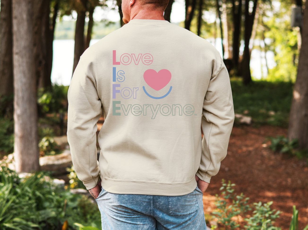 The L.I.F.E. "Love is for Everyone" Color Pop Crewneck pairs a clean front chest heart with a bold vertical back print that says it all. This men's/unisex graphic sweatshirt is soft, breathable, and made for everyday comfort from slow Sundays to out-and-about errands.