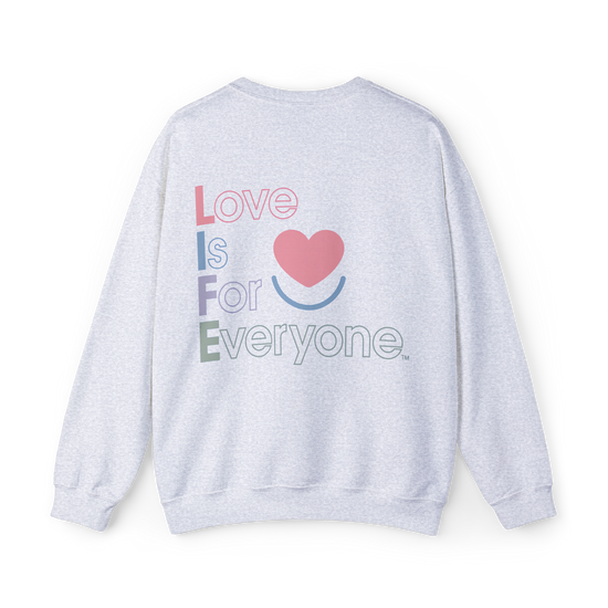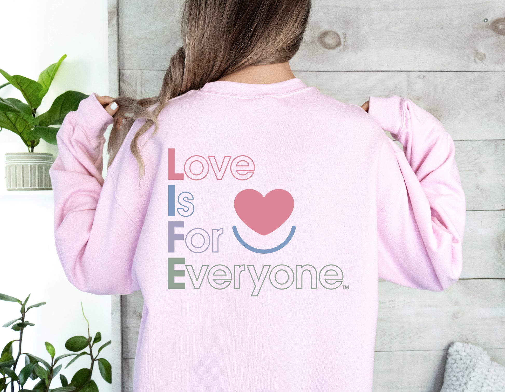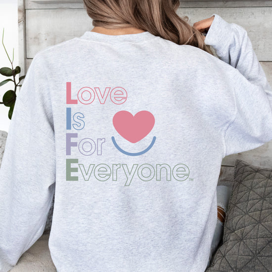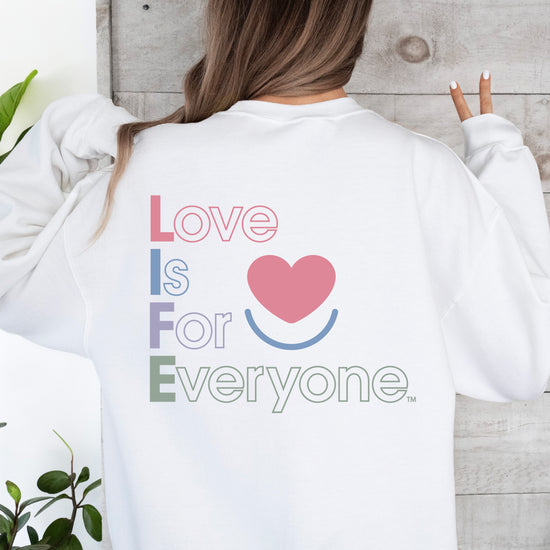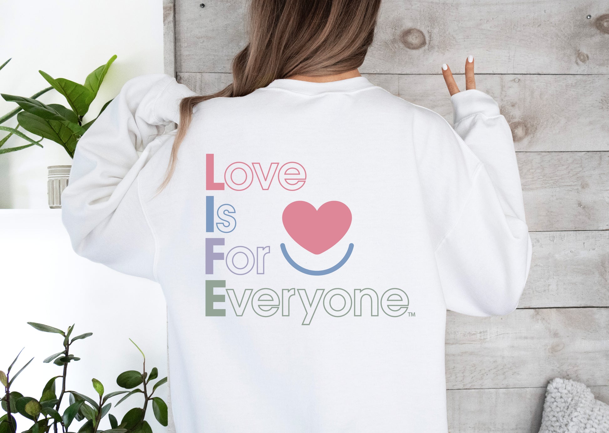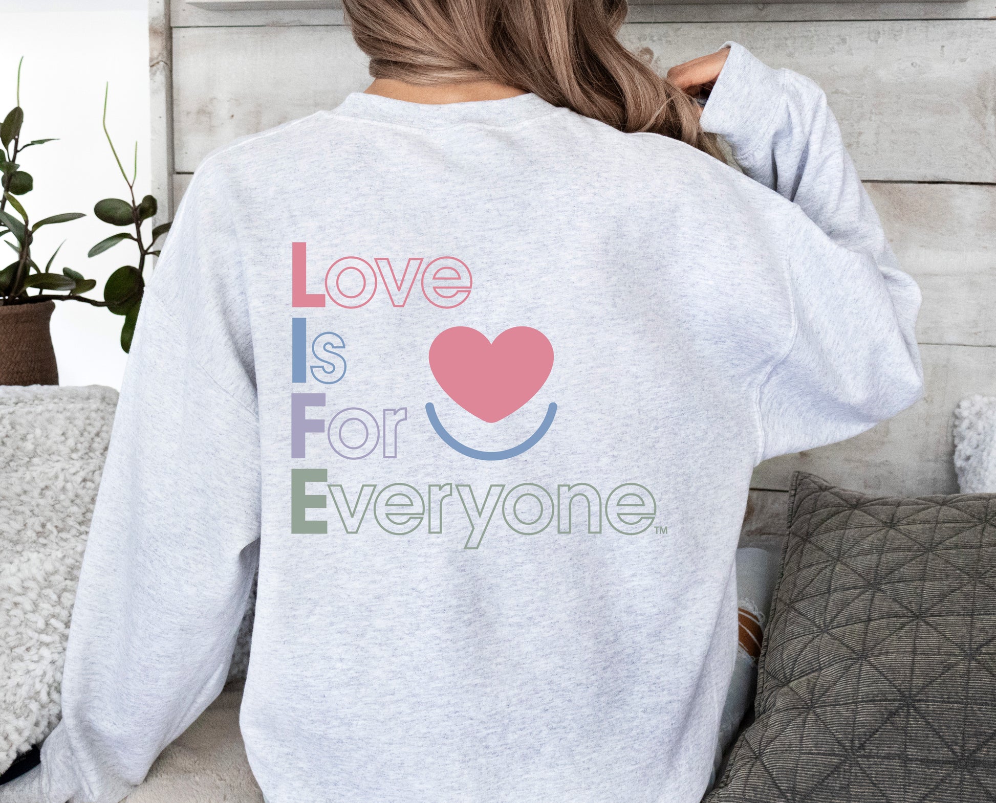 The L.I.F.E. "Love is for Everyone" Color Pop Crewneck keeps the front clean with a sweet center-chest heart/smile and the message loud on the back in our playful Color Pop print. This women's/unisex graphic sweatshirt is soft, breathable, and made for cozy, uplifting everyday wear.