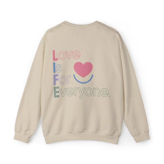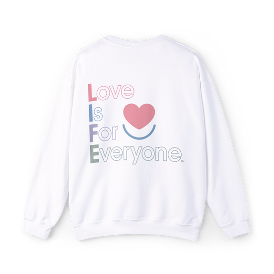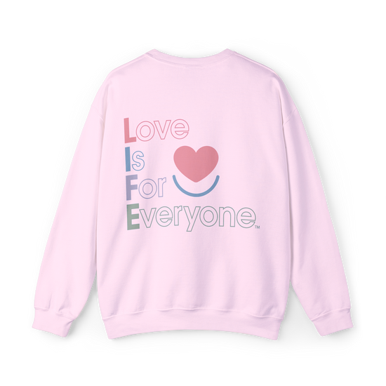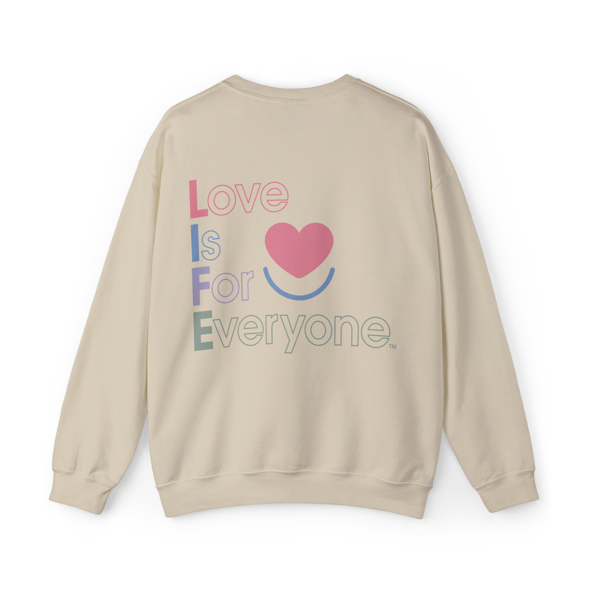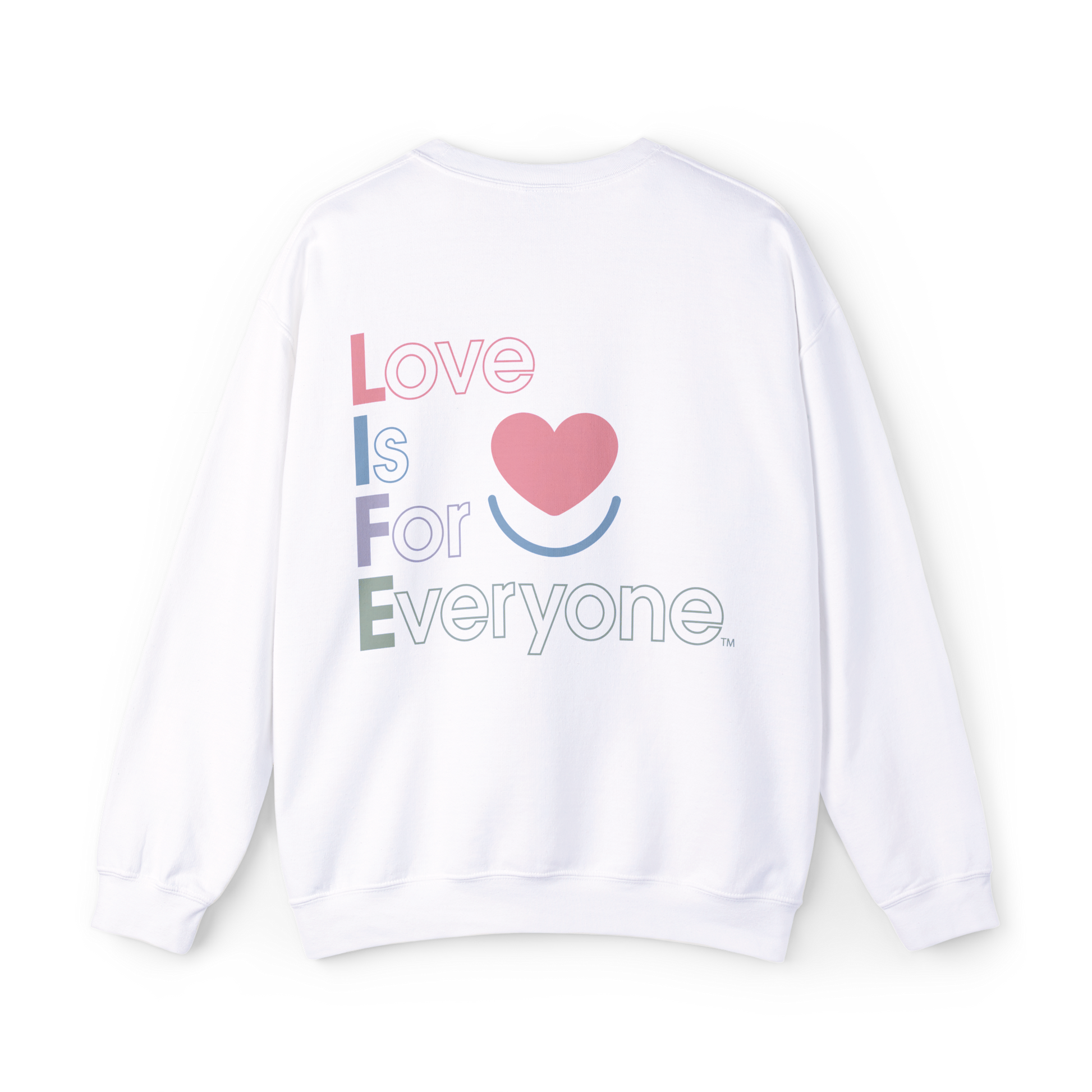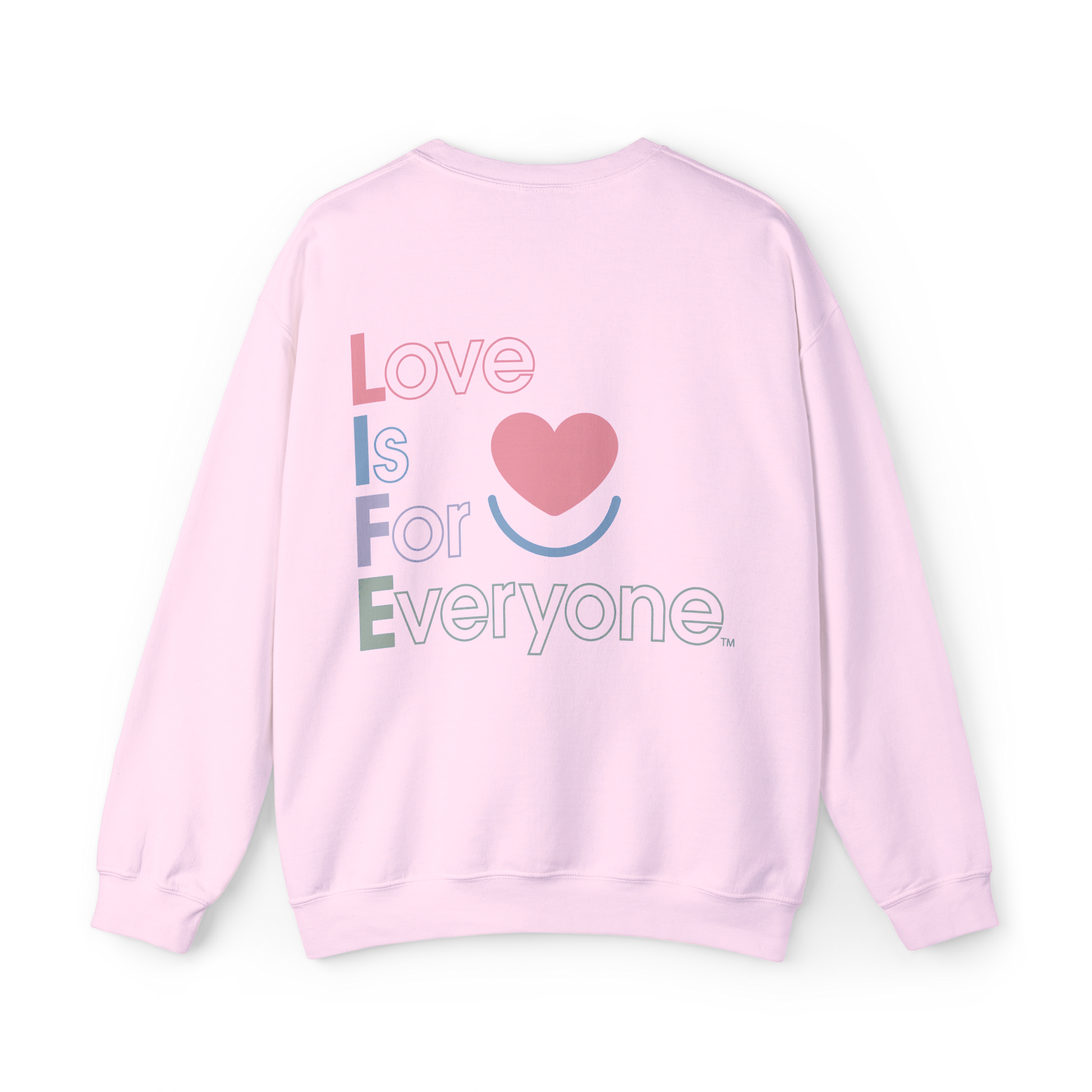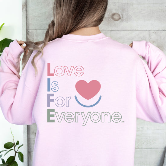 The L.I.F.E. "Love is for Everyone" Color Pop Crewneck keeps the front clean with a sweet center-chest heart/smile and the message loud on the back in our playful Color Pop print. This women's/unisex graphic sweatshirt is soft, breathable, and made for cozy, uplifting everyday wear.